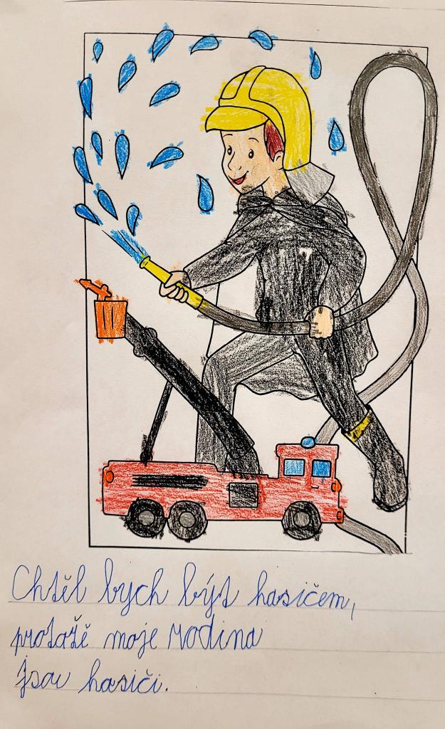 Na různá povolání si nejen hrajeme, my je dokonce malujeme. Obrázek žáci doplnili popiskem, proč bychom chtěli být zrovna hasičem, kovářem, učitelkou, prodavačkou nebo astronautem.