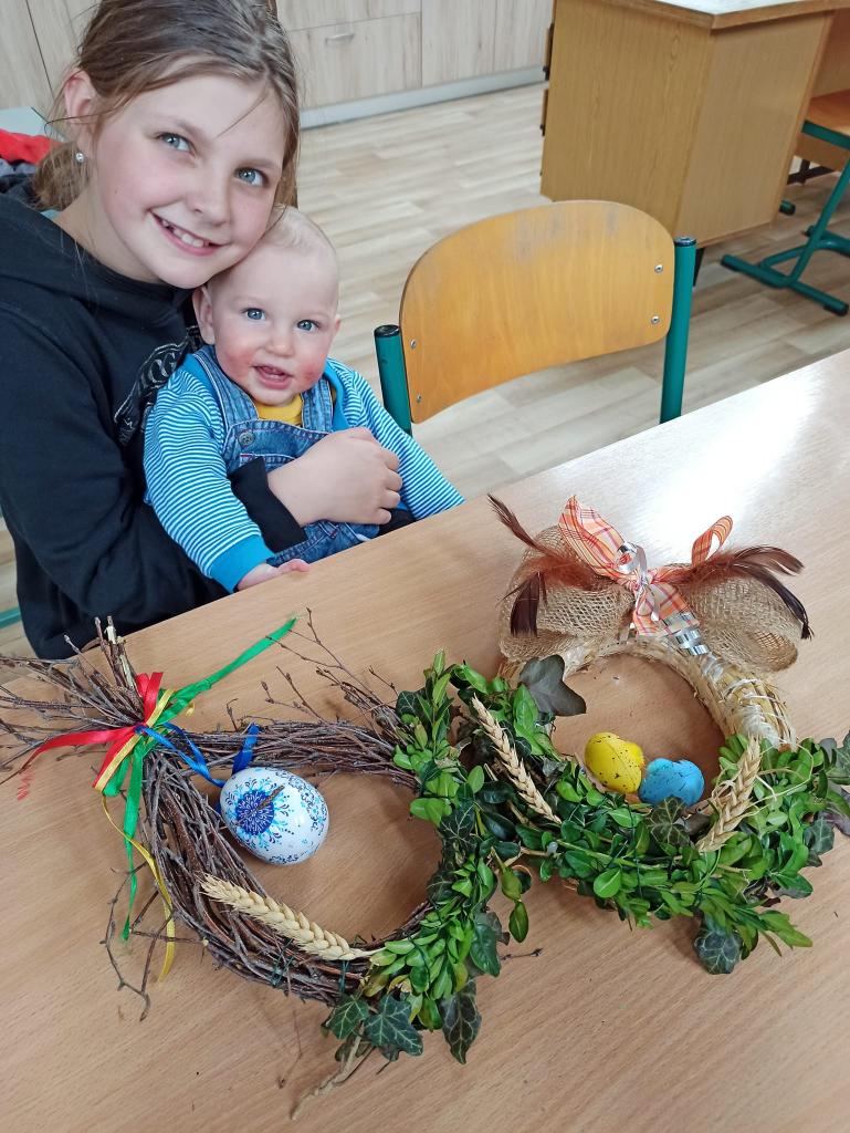 Bylo nás docela dost. Tentokrát jsme tvořili věnce na dveře. Hlavní ozdobou byla slepička z látky a skořápky vajec. Mašle, kuřata, květiny, větvičky, lýko - to už bylo na fantazii všech zúčastněných. Měli jsme za ty dva roky co dohánět a moc jsme si odpoledne užili.