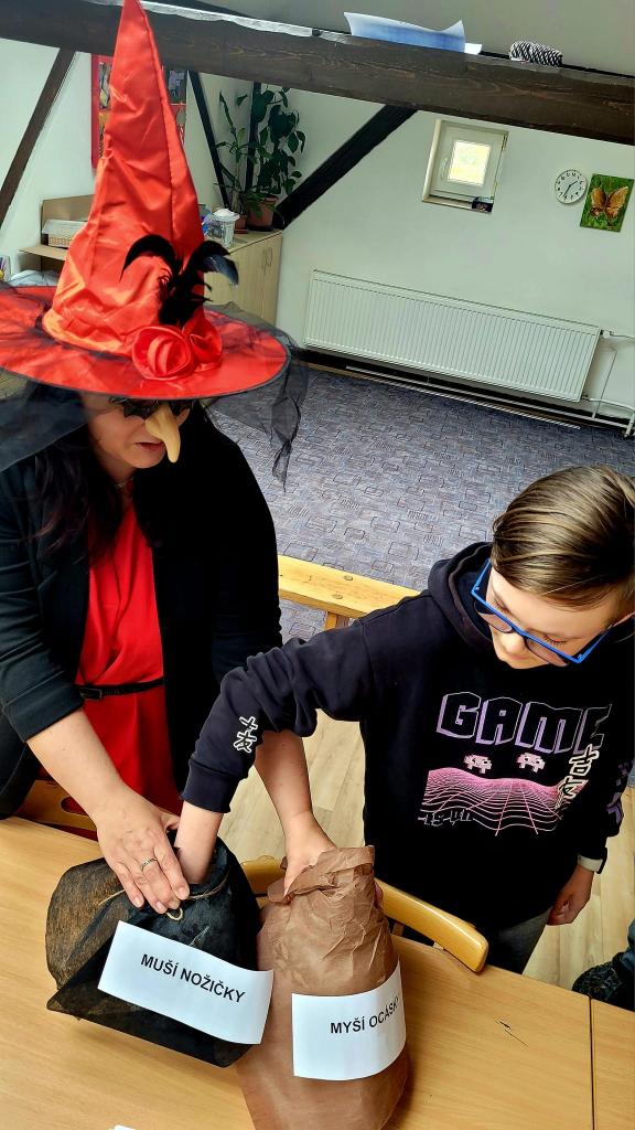 Ta naše nás pobavila zkouškou odvahy. Museli jsme sáhnout do nádob s mušími křídly a myšími ocásky a hledat poklad. Trošku jsme se obávali, na co doopravdy sáhneme, ale poklad jsme našli všichni. Nakonec se čarodějnice kouzlem proměnila v paní vychovatelku Gajdošíkovou. To se nám ulevilo!